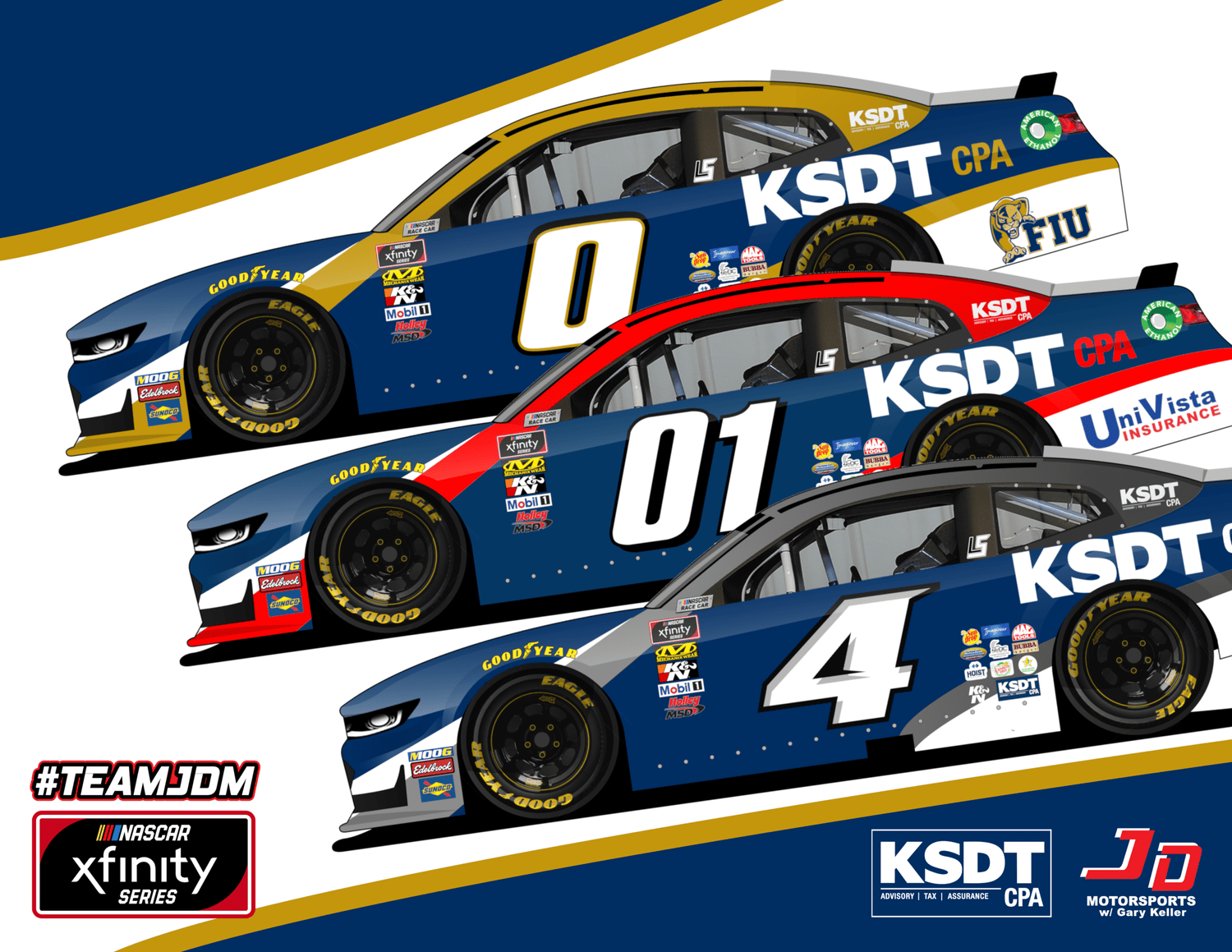 KSDT CPA will serve as the primary sponsor onboard the No. 4 KSDT Chevrolet of BJ McLeod. Additionally, they will be represented on the No. 0 Chevrolet driven by Garrett Smithley in a co-branding with Florida International University. And to top it off, the firm will be on the No. 01 Chevrolet driven by Stephen Leicht, in a partnership with Univista Insurance.